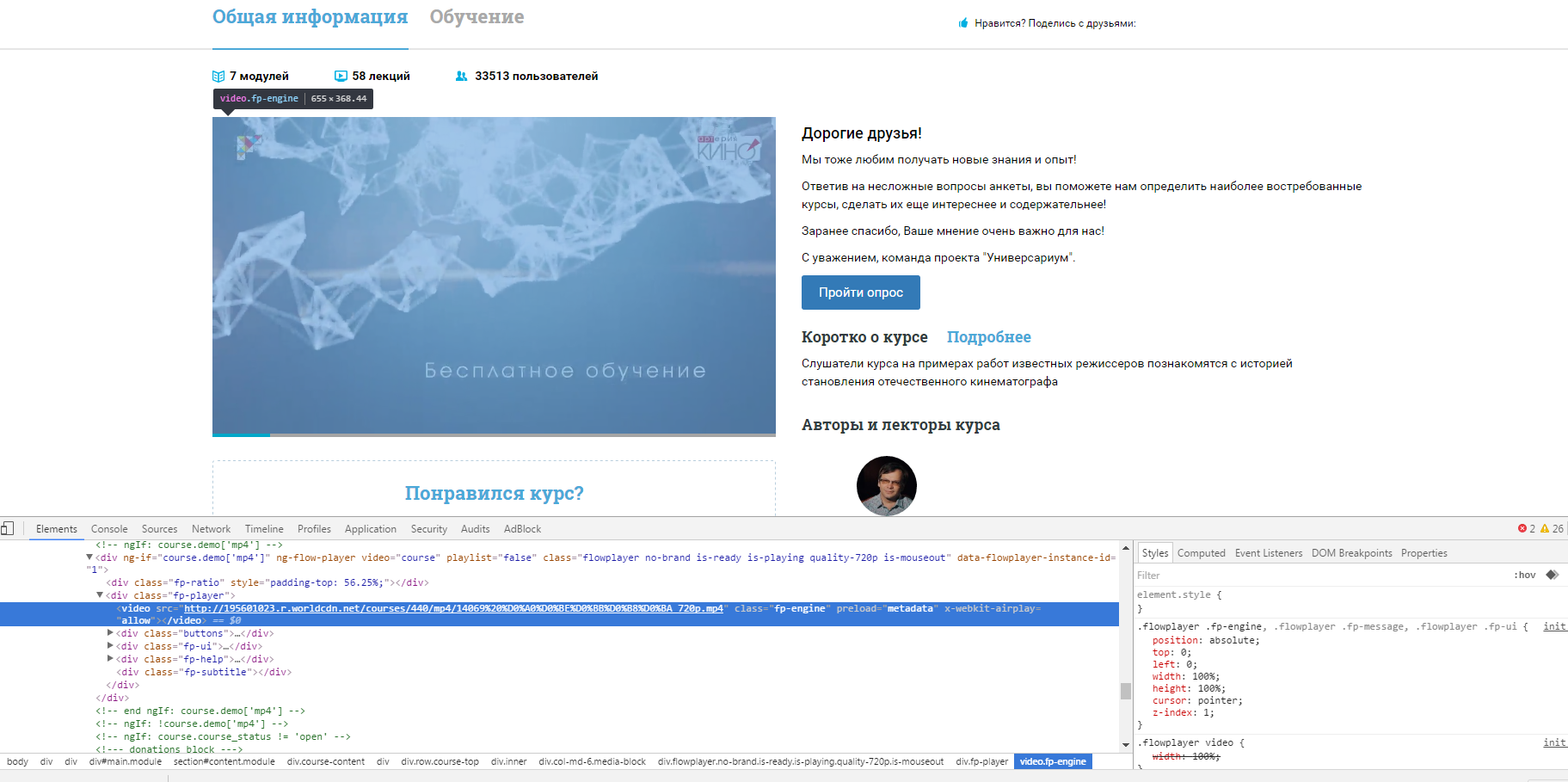 "Открываю интересующий меня модуль. Нажимаю Ctrl+U. В открывшемся окне содержится код страницы. Нахожу строку вида: http://static-cdn.universarium.org/video_fragments/191/mp4/Economic06_1.1_1080p_360p.mp4" (выбираю без кавычек, открываю ссылку в новом окне), нажимаю правую лапку мышки и выбираю "записать как...".